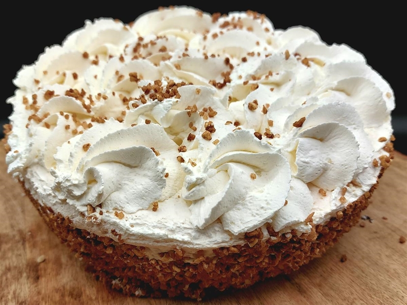 8 / 10 personen | de schuimtaart wordt bij ons vers gemaakt en ingevroren. Voor het optimale genot: anderhalf uur / uur van te voren uit de vriezer halen en op kamertemperatuur laten ontdooien! TIP: bevroren snijden!